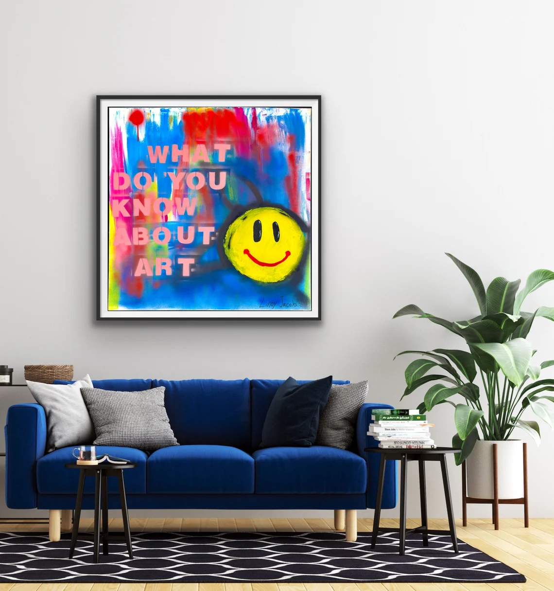 Colorful lion painting by Linoy Jacob featuring bold brushstrokes, expressive eyes, and vibrant multicolor mane on canvas.Colorful lion painting by Linoy Jacob displayed in a modern interior with a yellow armchair and minimalist décor.
