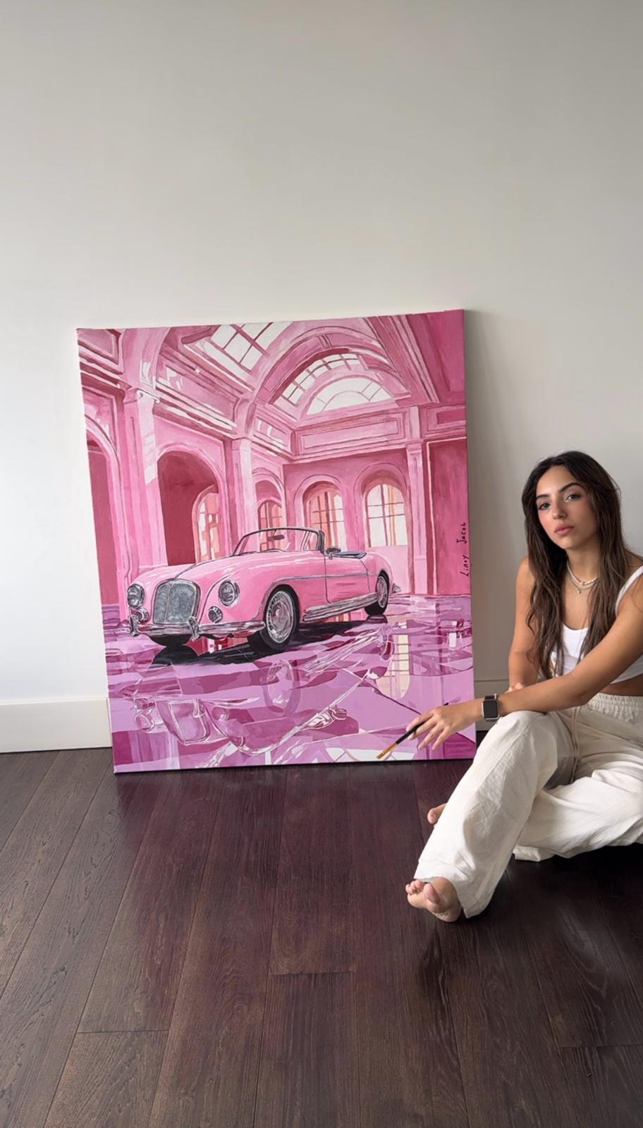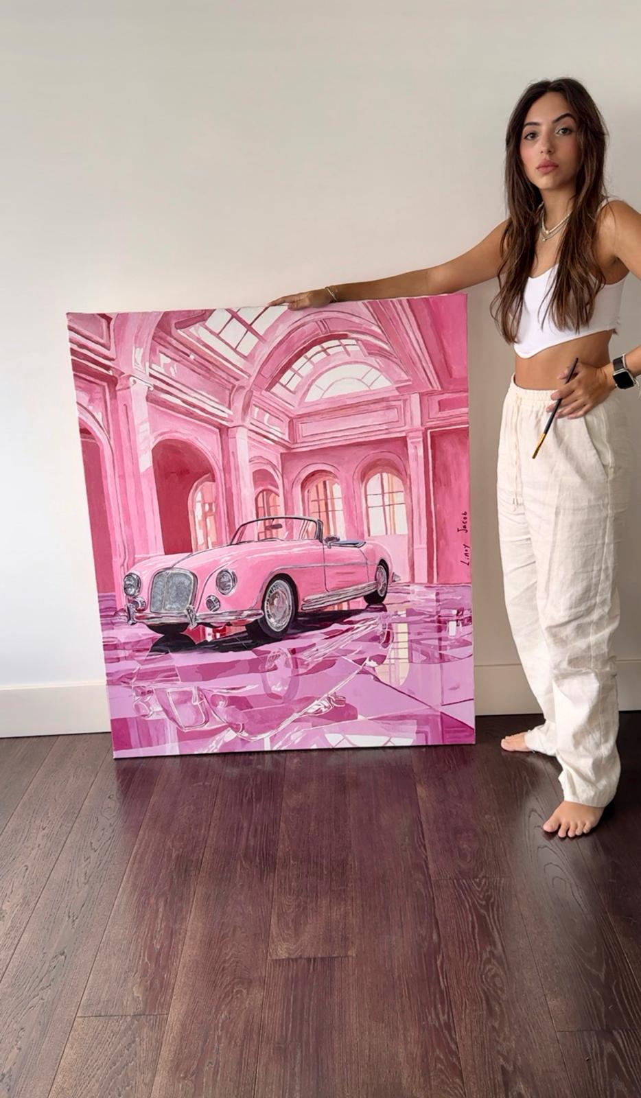 The architectural hall amplifies the sense of grandeur, while the luminous pink palette speaks not of softness, but of confidence and the thrill of self-made achievement.