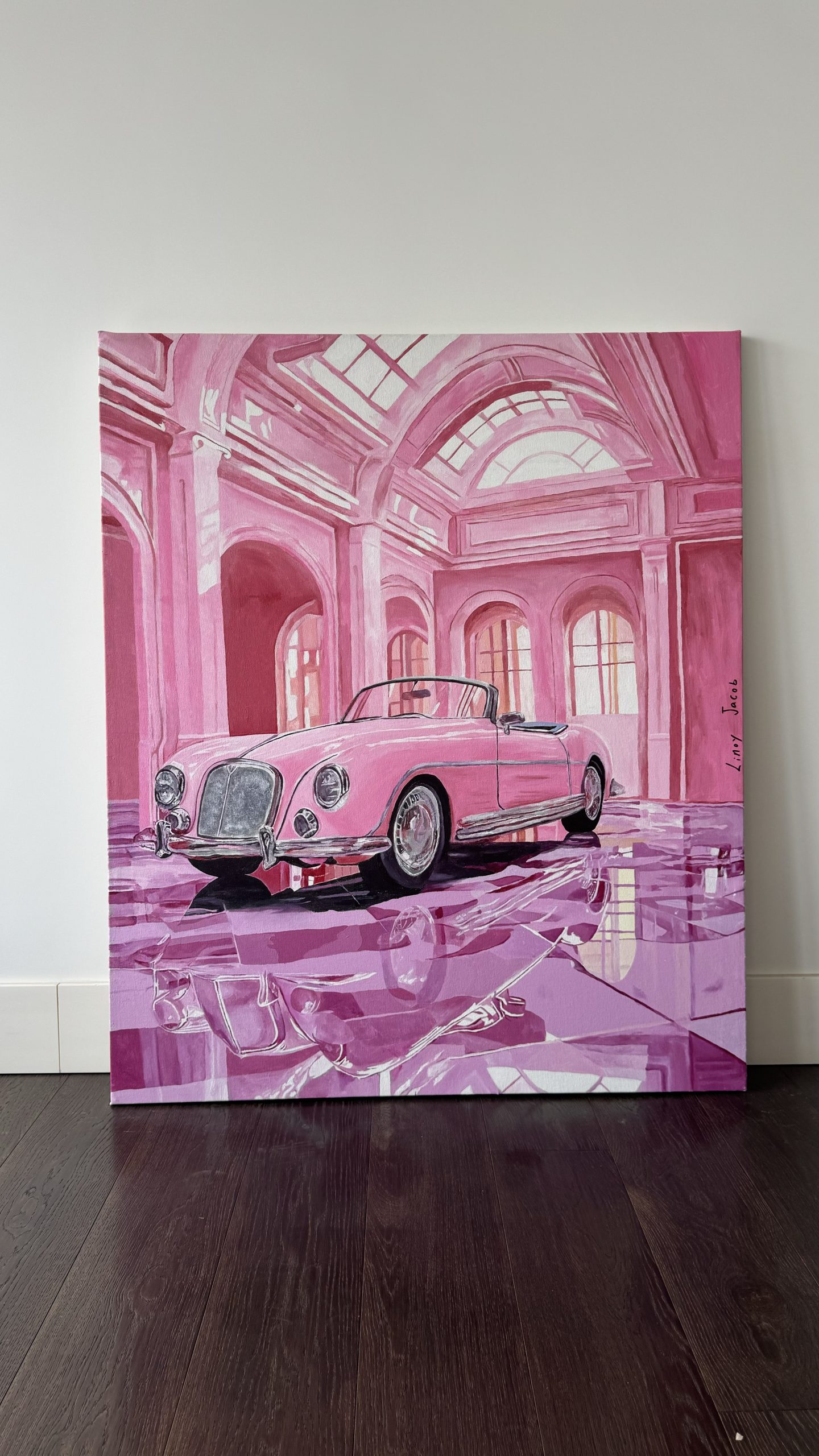 The architectural hall amplifies the sense of grandeur, while the luminous pink palette speaks not of softness, but of confidence and the thrill of self-made achievement.